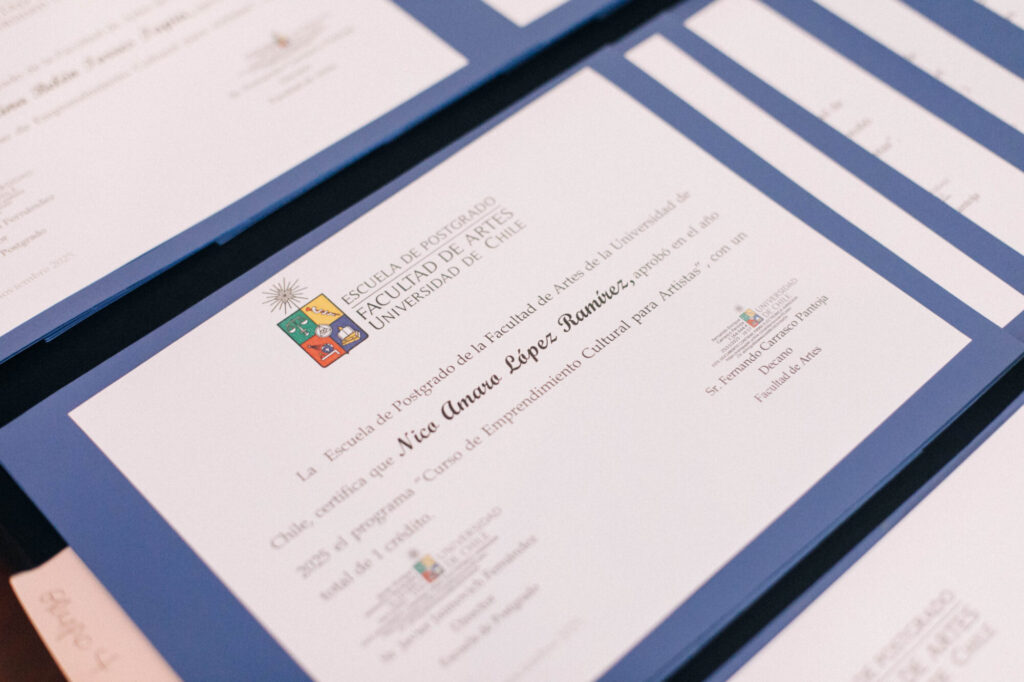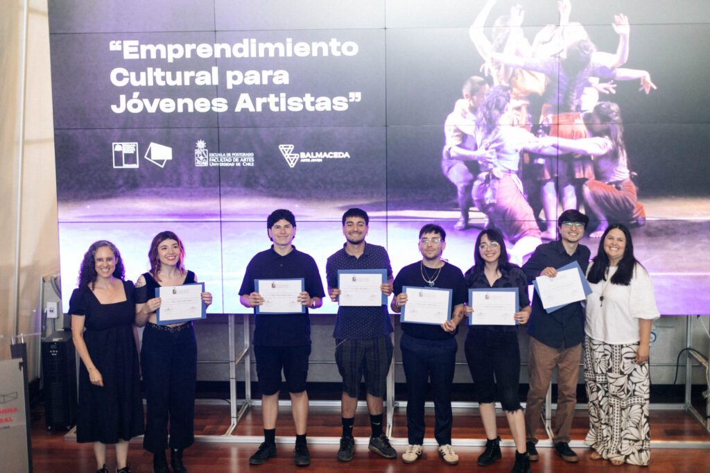 Con la presencia de la jefa del departamento de Fomento de la Cultura y las Artes del Ministerio de las Culturas, Claudia Gutiérrez Carrosa; el decano subrogante de la Facultad de Artes de la Universidad de Chile, Luis Montes Rojas; y la directora ejecutiva de la Corporación Cultural Balmaceda Arte Joven, Loreto Bravo, el jueves 4 de diciembre se llevó a cabo la ceremonia de cierre y entrega de certificados del Curso de Emprendimiento Cultural para Artistas.